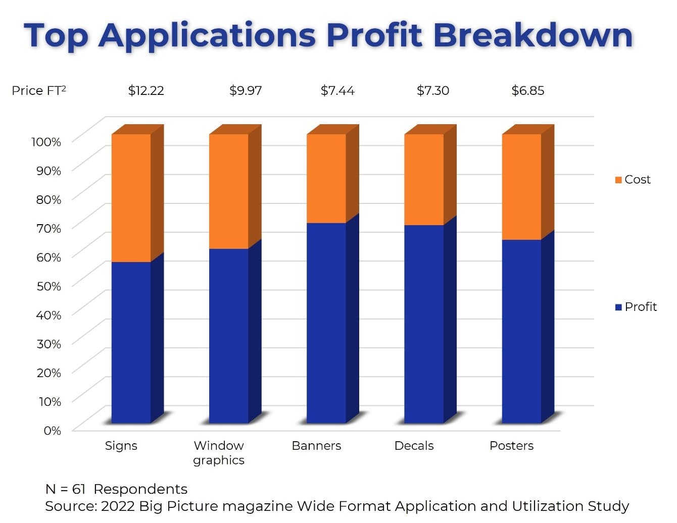 Profit margins across the top applications are notably strong, with banners, decals, billboards, building wraps, and backlit displays all achieving GPMs exceeding 56%. Banners and decals stand out as leaders in profitability, boasting margins of 69%, making them a reliable and high-performing choice for PSPs. Meanwhile, high-end applications like building wraps and backlit displays not only offer substantial margins but also command premium pricing, reflecting their added value and visual impact. These premium products present excellent opportunities for PSPs looking to differentiate their offerings, tap into higher-value markets, and maximize their overall returns.